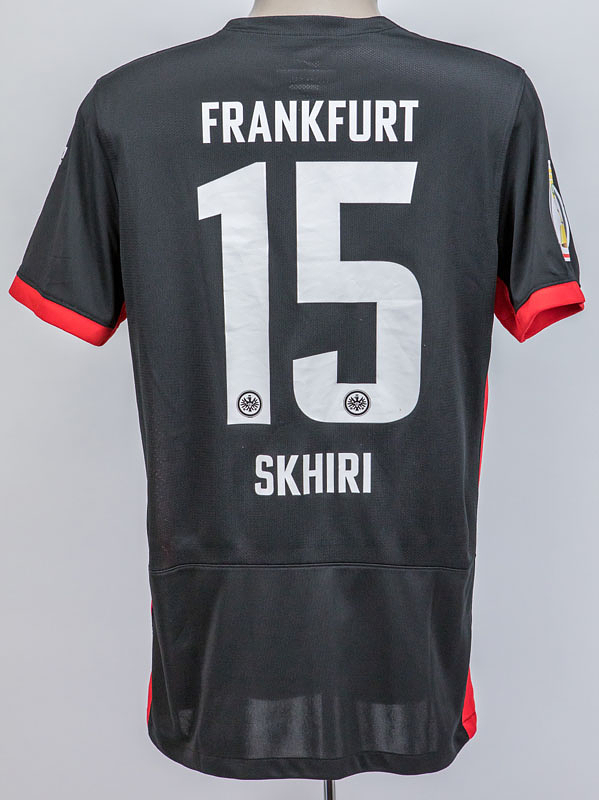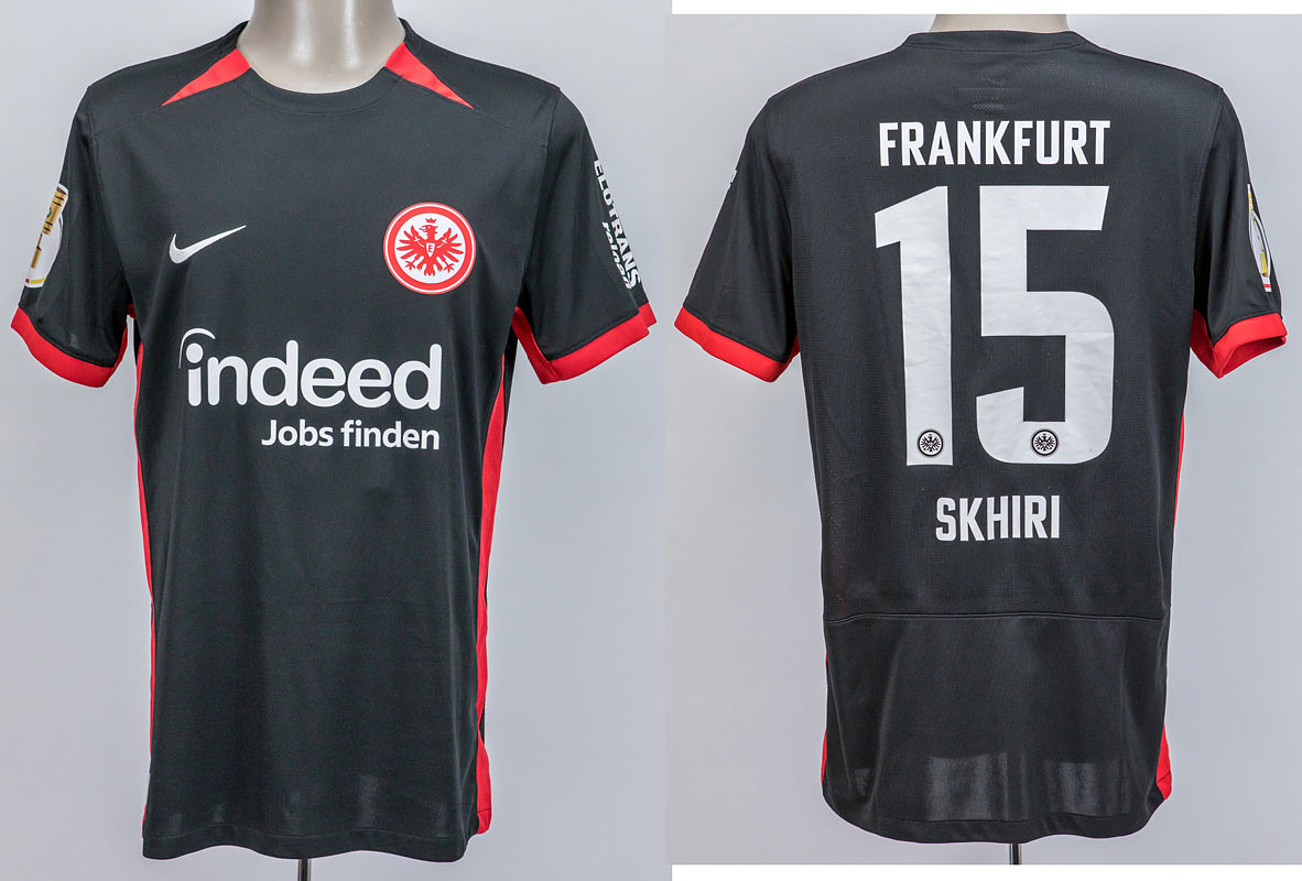 Original match worn Eintracht Frankfurt Spielertrikot mit der Nummer 15. Getragen von Ellyes Skhiri am 04.12.2024 im Achtelfinale des DFB Pokals gegen RB Leipzig. RB - Frankfurt 3:0. Skhiri ist 70-facher Nationalspieler von Tunesien. Status:AAB.