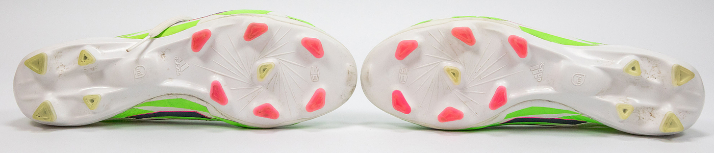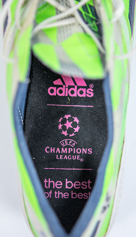 Original match worn Fußballschuhe vom Fußball - Weltmeister 2014 und mehrfachen deutschen Meister mit Bayern München Thomas Müller. Aididas adizero F50. Größe 9,5. Handgemacht für Thomas Müller vom adidas "Athlet service". Mit der seitlichen Aufschrift auf beiden Schuhen "lisa 13" und dem bayerischen Wappen. Handschrifltiche Größenangabe auf den Seitenteilen der Schuhe "9,5". Schuhe mit straken Spielspuren. Ca. 2014/2015. Status:ABB.