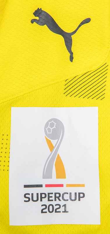 Trikot kurzarm mit Knopfleiste; Größe M; Vereins-Logo, 2 Meistersterne und Puma-Logos gummiert; Werbeaufdruck 'evonik', Rückennummer, Spielername und Schriftzug 'Dortmund' gummiert; Schriftzug 'BVB' auf Kragenrückseite gestickt; Lüftungslöcher gelasert(Laser Holes); mit Supercup 2021 Patch und GLS. Patch; Puma. Zustand: A