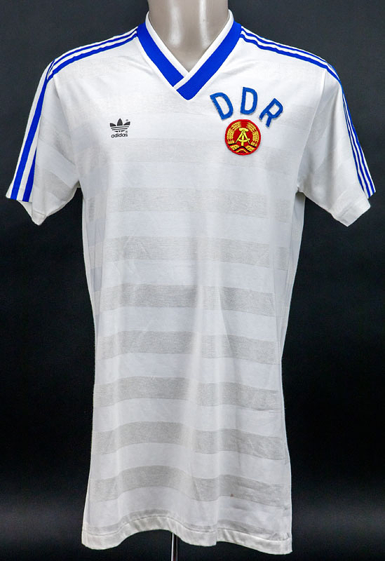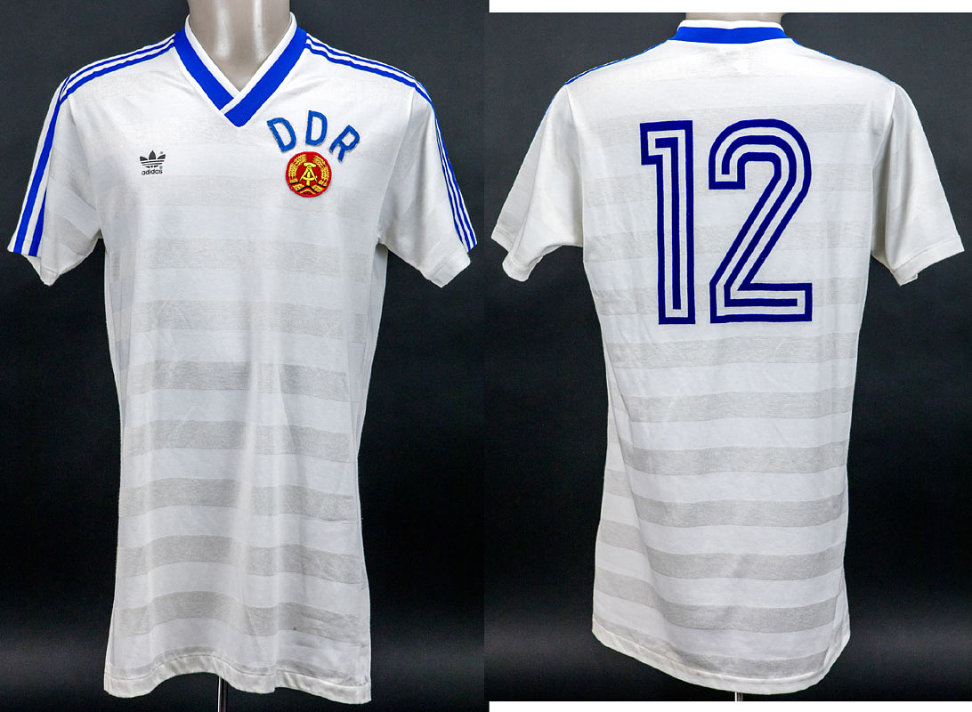 Original match worn / issued Spielertrikot von der DDR mit der Rückennummer 12. Getragen in einem Freundschaftsspiel für die DDR Fußball Nationalmannschaft in den 1980er Jahren. Status: ACC.