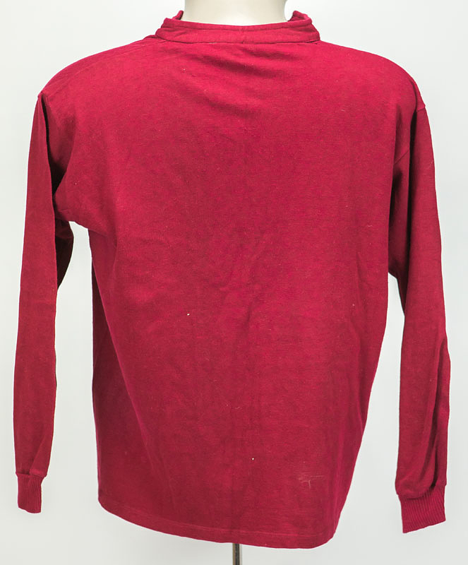 Langarm Trikot mit Schnürung. Größe: 5. Hersteller: Fribieso Sport. Besticktes 1.FCN - Wappen aufgenäht. Ohne Rückenummer. Es handelt sich vermutlich um ein Trikot aus dem Jugendbereich. Es könnte aber auch ein Trikot ohne Rückennummer für einen kleinen Spieler der Oberliga- / Bundesligamannschaft des 1.FC Nürnberg handeln. --Sehr guter Zustand, bis auf kleine kaum sichtbare Reperaturspuren an den Nähten. Zustand: A