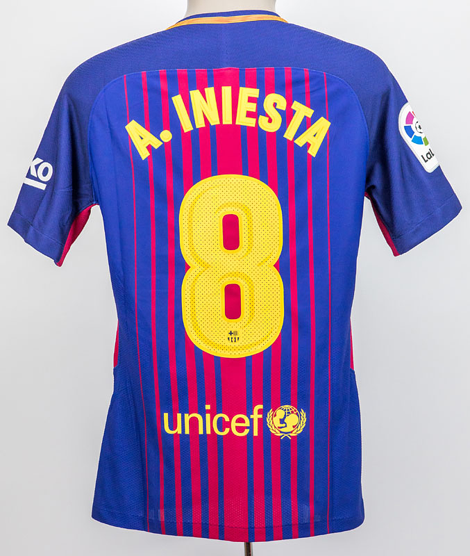 Original match worn Spielertrikot vom FC Barcelona mit der Rückennummer 8. Getragen von Andres Iniesta in einem Spiel der spanischen LaLiga in der Saison 2017/2018. Iniesta ist Fußball Weltmeister 2010 un Europameister 2008 und 2012 mit Spanien. Status:ABC.