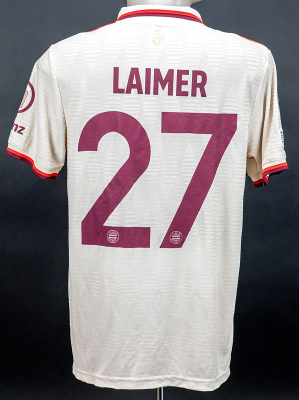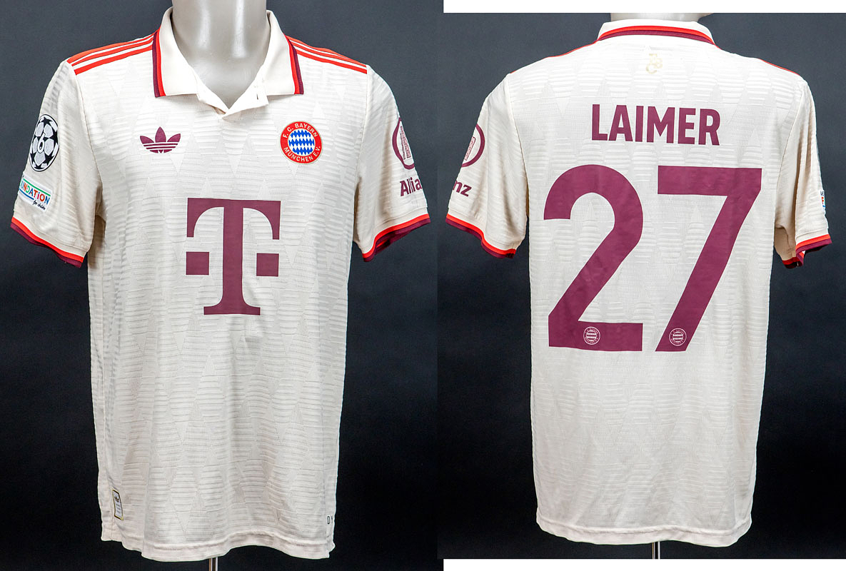 Original match worn Spielertrikot von Bayern München mit der Rückennummer 27 Getragen von Konrad Laimer in einem Spiel der UEFA Champions League in der Saison 2024/2025. Laimer ist 49-facher Nationalspieler von Österreich.Status:ABB.