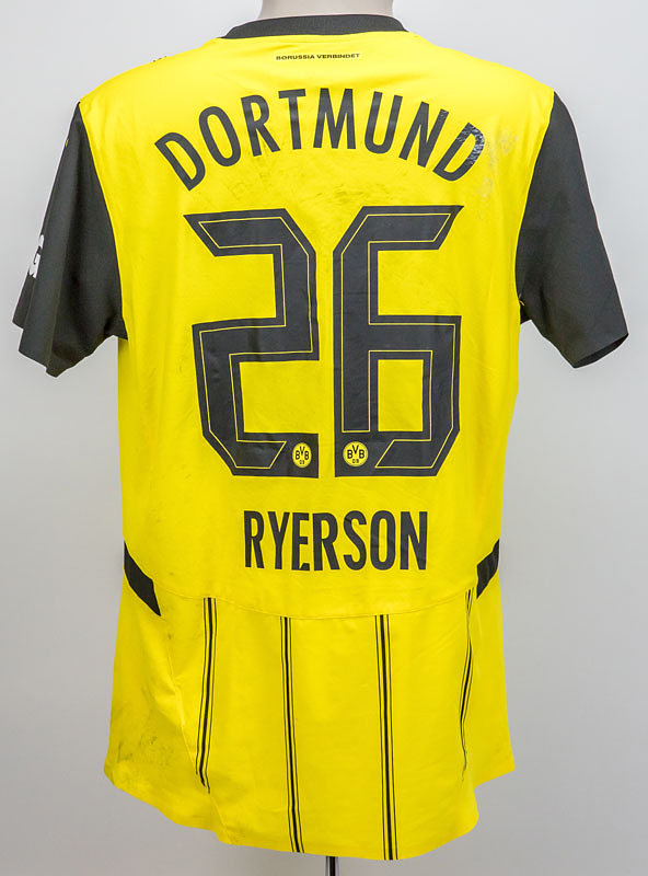 Original match worn Spielertrikot von Borussia Dortmund mit der Rückennummer 26. Getragen von Julian Ryerson in einem Spiel der Fußball Bundesliga in der Saison 2024/2025. Ryerson ist 30-facher Nationalspieler von Norwegen. Ungewaschen Status:ABB.