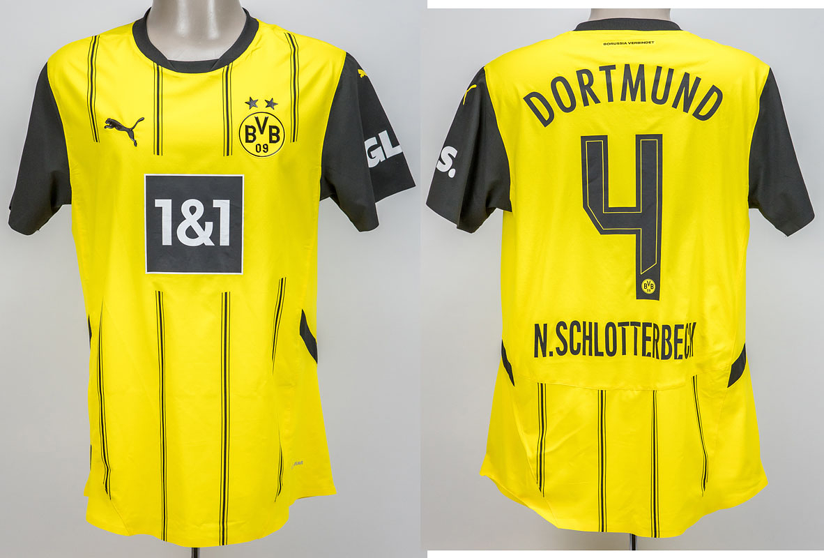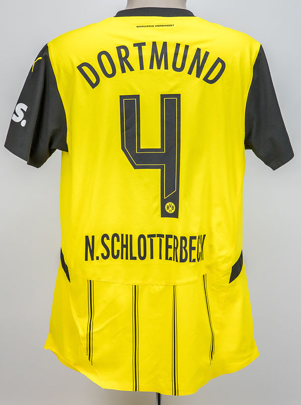 Original match worn Spielertrikot von Borussia Dortmund mit der Rückennummer 4. Getragen von Nico Schlotterbeck am 23.11.2024 im Spiel der Fußball Bundesliga gegen den SC Freibirg. Dortmund - Feiburg 4:0. Schlotterbeck ist 20-facher Nationalspieler von Deutschland. Status:AAB.