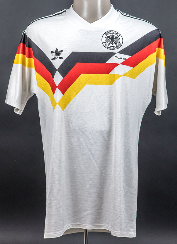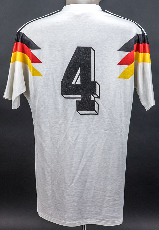 Spielertrikot kurzarm; DFB-Logo und adidas-Logo gestickt; Schriftzug 'Italia'90' gestickt; Rückennummer geflockt; Trikot hat Gebrauchsspuren (Etikett auf einer Seite gelöst und leicht verwaschen aber noch lesbar); adidas. Zustand: A-