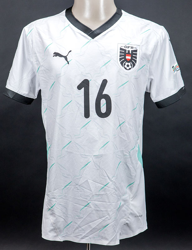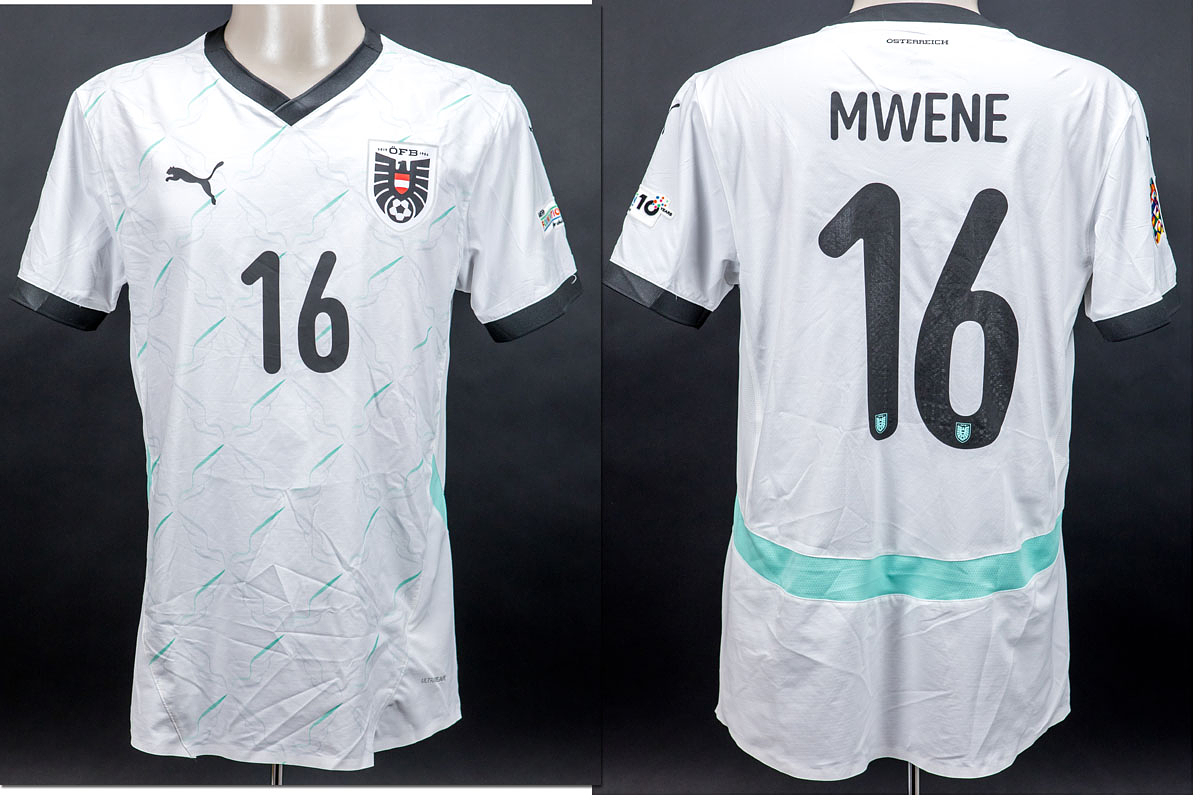 Original match worn Spielertrikot von Österreich mit der Rückennummer 16. Getragen von Phillipp Mwende am 23.03.2025 im Relegatiobsspiel zur UEFA Nations League gegen Serbien. Serbien - Österreich 2:0. Trauner ist 16-fachder Nationalspieler von Österreich. Status:AAB.