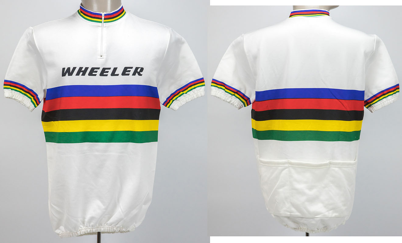 Original Radsport Trikot für einen deutschen Weltmeister 1999 in der 4000 m Teamverfolgung. Regenbogentrikot mit der Werbeaufschrift "Wheeler". Status:ABC.