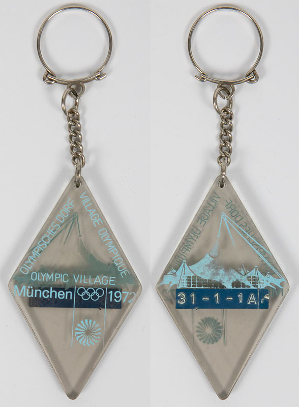 Original Schlüsselanhänger der Oympischen Spiele München 1972 für das Olympische Dorf. Mit der Silhouette des Olympiastadions und der Aufschrift "Olympischen Dorf Village Olympique Olympic Village. München 1972. Plexiglas, bedruckt, 7x4 cm. Schlüsselanhänger mit original Zimmernummern!.