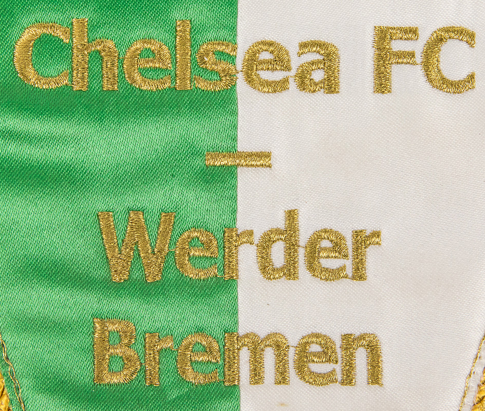 Original Spielwimpel mit golden gestickter Schrift „Champions League 12.9.2006. Chelsea FC - Werder Bremen“ mit aufgestickten Vereinsemblemen beider Teams. Seidenwimpel mit goldenen Seidenfransen, Metallkette und Metallstange. 41x28cm.