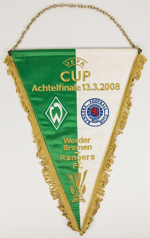 Original Spielwimpel mit golden gestickter Schrift "UEFA Cup Achtelfinale 13.3.2008 Werder Bremen - Rangers FC" mit aufgestickten Logos beider Vereine. Seidenwimpel mit goldenen Seidenfransen und Metallstange mit Kette. 40x28 cm.