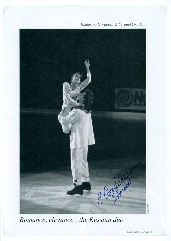 Originalsignatur auf s/w-Magazinfoto der Goldmedaillengewinner der Olympischen Spiele 1988 + 1994 im Eiskunstlaufen Ekaterina Gordeewa + Sergej Grinkov (1967-1995). 28x20,5 cm.