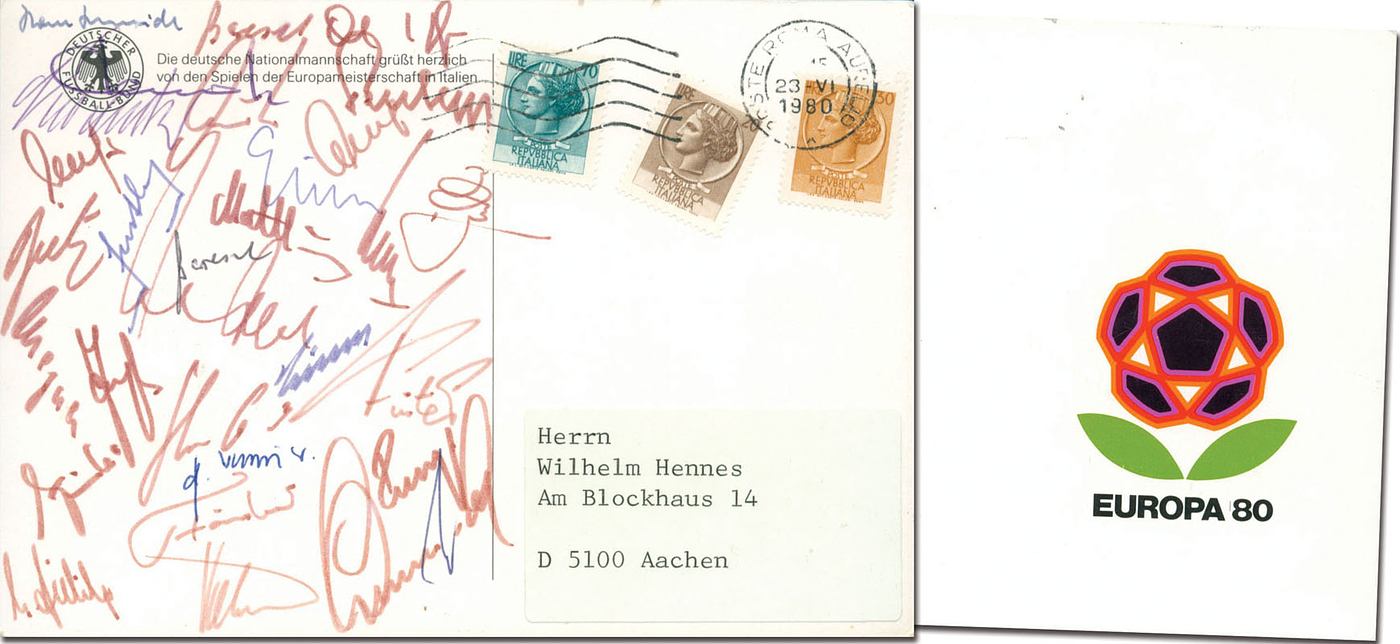 Postkarte von der UEFA Fußball-Europameisterschaft 1980 in Italien mit 24 original Signaturen der deutschen Spieler die in Rom UEFA Europameister wurden, 16x11,5 cm.