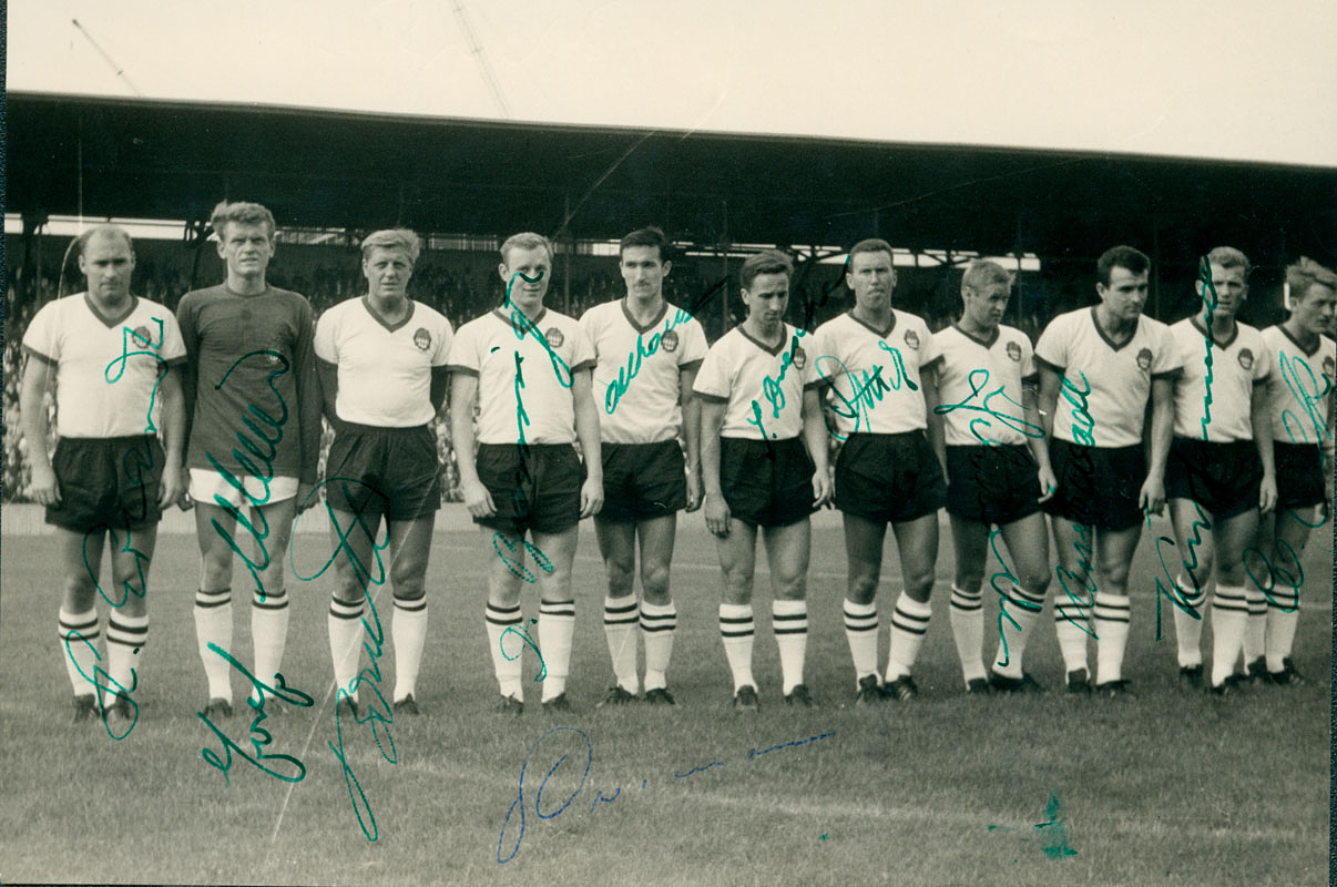 S/W-Mannschaftsfoto von Bayern München 1961 mit 12 original Signaturen aller abgebildeten Spieler, 17,5x12,5 cm.