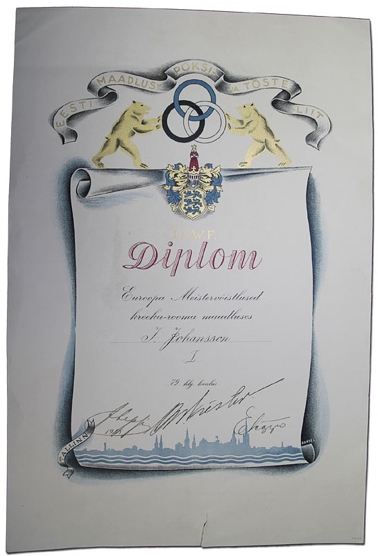 Siegerurkunde für die Europameisterschaften im Ringen 1938 in Tallinn (Estland) für den 1.Platz von Ivar Johansson (1903-1979; SWE; 3x Gold 1932 + 1936 bei den Olympischen Spielen; 9facher Europameister) in der Klasse bis 79 kg. 46x30,5 cm.