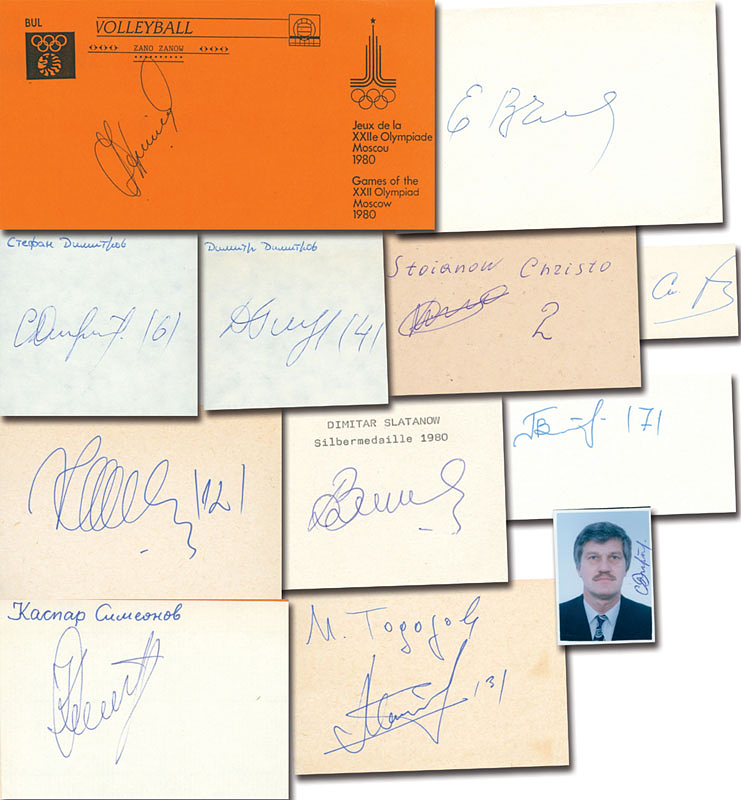 Silbermedaille im Volleyball Herren für Bulgarien bei den Olympischen Spielen 1980. Stojan Guntschew, Dimitar Slatanow, Christo Stojanow, Dimitar Dimitrow, Zano Zanow, Stefan Dimitrow, Petko Petkow, Mitko Todorow, Kaspar Simeonow, Emil Waltschew, Christo Iliew, Jordan Angelow. 1 Foto, 11 Blancobelege, 15x10 bis 5x4 cm. KOMPLETTES TEAM!.