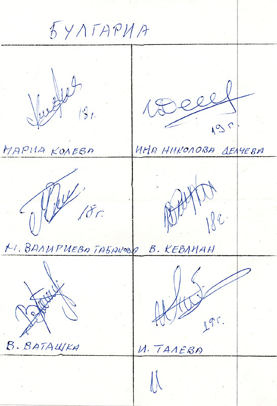 Silbermedaille Rhythmischen Sportgymnastik Mannschaft für Bulgarien bei den Olympischen Spielen 1996: 6 original Signaturen auf einem Blancobeleg: Ina Deltschewa, Walentina Kewlijan, Marija Kolewa, Maja Tabakowa, Iwelina Talewa, Wjara Wataschka, 20x14 cm. Komplettes Team.