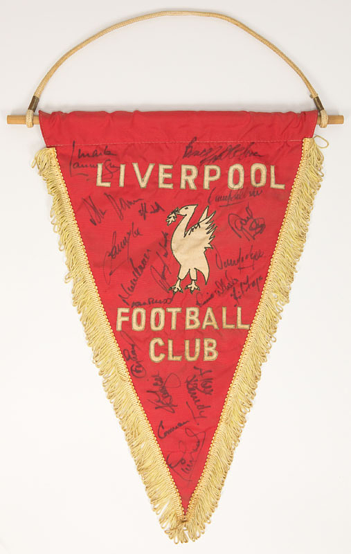 Souvenirwimpel des Liverpool FC mit 18 original Signaturen der Spieler des FC Liverpool aus dem Jahre 1978 dem Sieg im Europapokal der Landesmeister. Seidenwimpel mit aufgestetzten, genähten Schiftzug "Liverpool Footall Club" und aufegnähtes Vereinslogo. Seidenfransen. Holzstange. 43x29 cm.