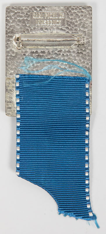 Teilnehmerabzeichen "77. IOC Session Innsbruck" von 1976 mit blauem Seidenband, Edelstahl, 9,5x3,6 cm.