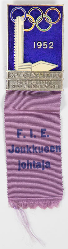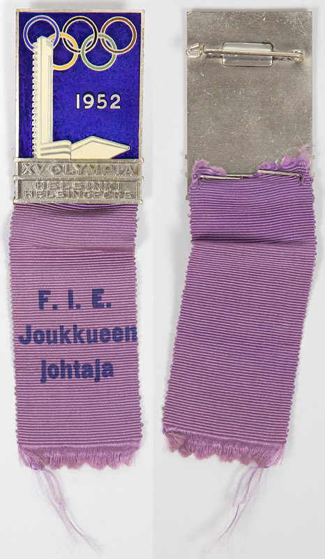 Teilnehmerabzeichen „F.I.E. Joukkueen johtaja" (Fechten Mannschaftsführer) für die Olympischen Spiele Helsinki 1952. Bronze, versilbert, mehrfarbig emailliert, mit bedrucktem violettem Seidenband. 11,5x3,3 cm.
