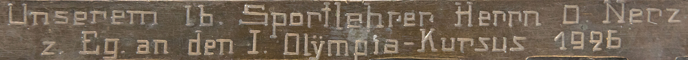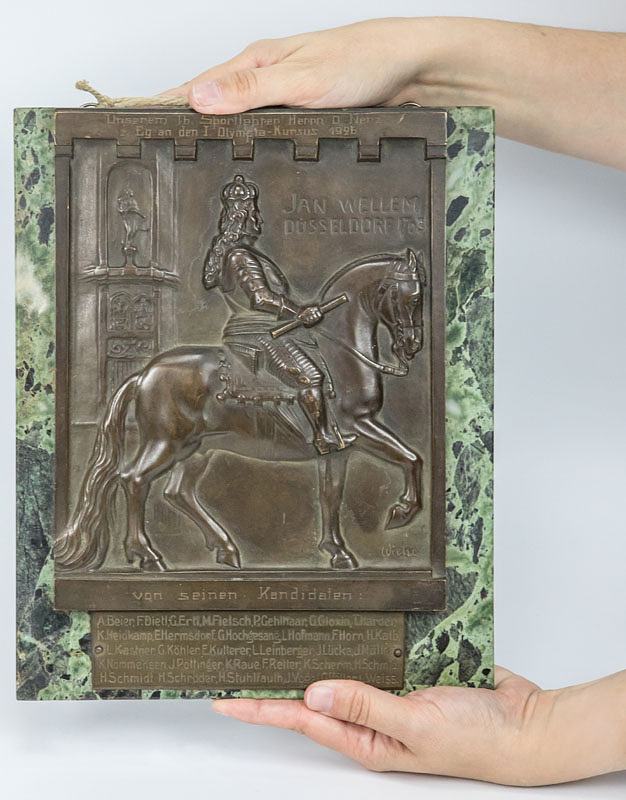 Wandplakette für den ersten deutschen Reichstrainer (Bundestrainer) der deutschen Nationalmannschaft. Geschenk von den deutschen Nationalspielern anläßlich des ersten Sichtungslehrgang 1926. Mit der Inschrift "Unserem lb. Sportlehrer Herrn O.Nerz z. Eg. An den I. Olympia Kursus 1926" "von seinen Kanditaten". Alle graviert auf einer großen Bronzetafel (24x19 cm) des Düsseldorfer Bildhauers Wieh. Darunter eine Bronzeplakette mit den gravierten 31 Namen der Spieler des ersten Sichtungslehrganges 1926. Beide Stücke auf Marmorplatte montiert. Gewicht: 4 kg. 29x23,5 cm UNIKAT!!!.