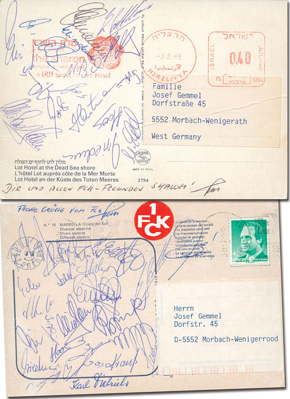 Zwei signierte Postkarten mit den Unterschriften der Spieler des 1.FC Kaiserslautern aus den Trainingslager 1989 in Israel und 1990 aus Marbella, je 15x10 cm.