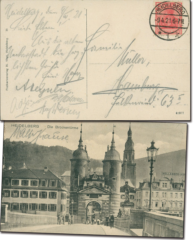 Postkarte wurde bei einem Zwischenstop in Heidelberg 8.10.1921 abgeschickt. Zustand: A-