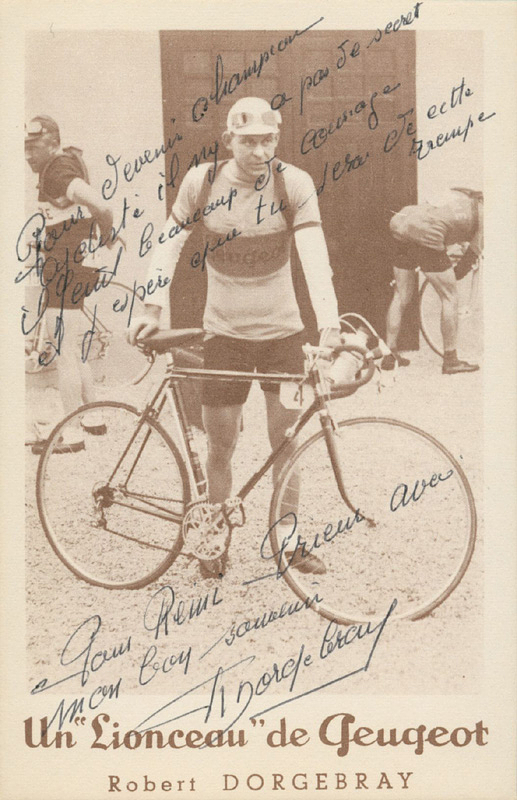 Dorgebray, Robert | (1915-2005) s/w-Autogrammkarte mit Originalsignatur und Widmung von Robert Dorgebray. Französischer Radrennfahrer. Gold bei den Olympischen Spielen 1936 in der Mannschaftswertung des Straßenrennens. 13,9x9 cm.