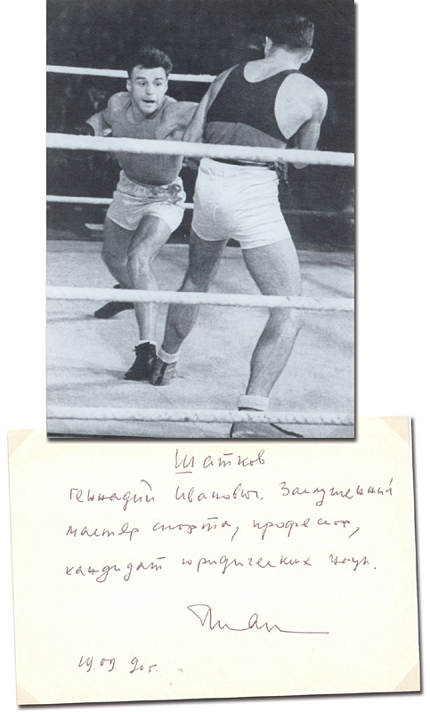 Shatkow, Gennadi | (1932-2009) Blancobeleg mit original Signatur von Gennadi Shatkow (URS). Goldmedaille im Boxen Mittelgewicht bei den Olympischen Spielen 1956. 13x9 cm.