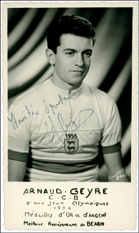 Geyre, Arnaud | (1935-2018) Foto Autogrammkarte mit original Signatur von Arnaud Geyre (FRA). Gold- und Bronzemedaille bei den Olympischen Spielen 1956 im Radsport Straße Einzeln und Team, 14x8,5 cm