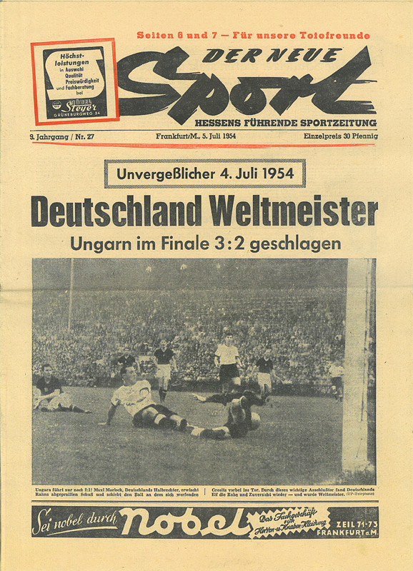 Zeitungen WM 1954 | 4 verschiedene deutsche original Sportzeitungen aus dem Juli 1954, die mit dem Sieg der deutschen Mannschaft bei der Fußball - Weltmeisterchaft 1954 titeln: Der Fußball Sport, Köln; Neue Woche, Hannover; Fußball - Woche; Berlin DDR; De neue Sport, Fankfurt. 47x32 bis 32x23 cm