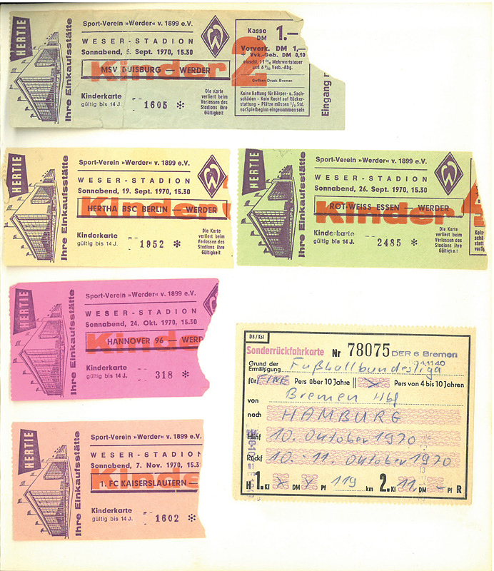Bremen,Werder-Ticketsammlung 1970-1979 | Bundesligaticketsammlung Werder Bremen 1970 - 1979. 66 Eintritskarten von Werder Bremen (Bundesliga, DFB-Pokal, Europapokal). An den Ecken in einem Fotoalbum eingeklebet (lassen sich leicht herauslösen). Außerdem zwei DFB Länderspieltickets in Bremen (1973 + 1980).