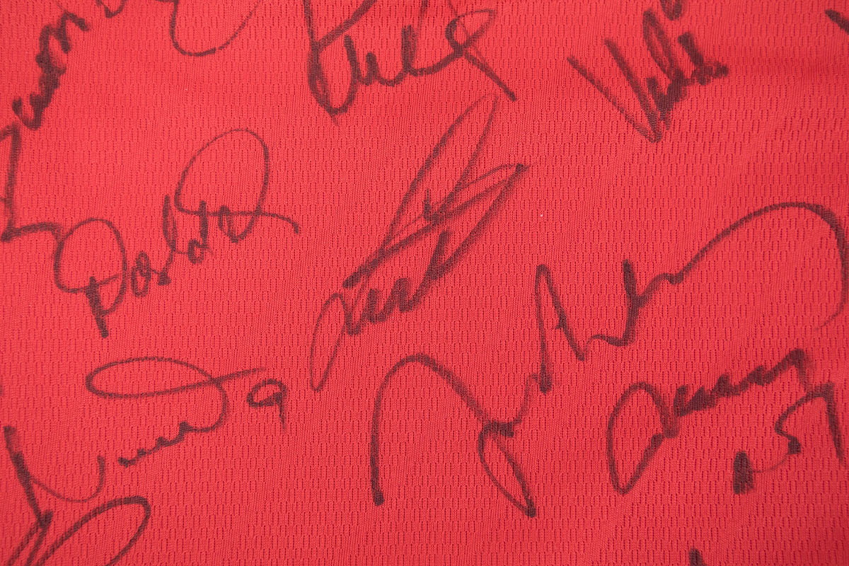 Tschechien - Trikot 1996 | Fantrikot der tschechischen Nationalmannschaft aus dem Jahre 1996 mit ca. 22 original Signaturen der Spieler des Teams von Tschechien die 1996 Vize - Europameister wurden. Puma Größe XL.