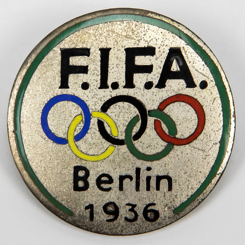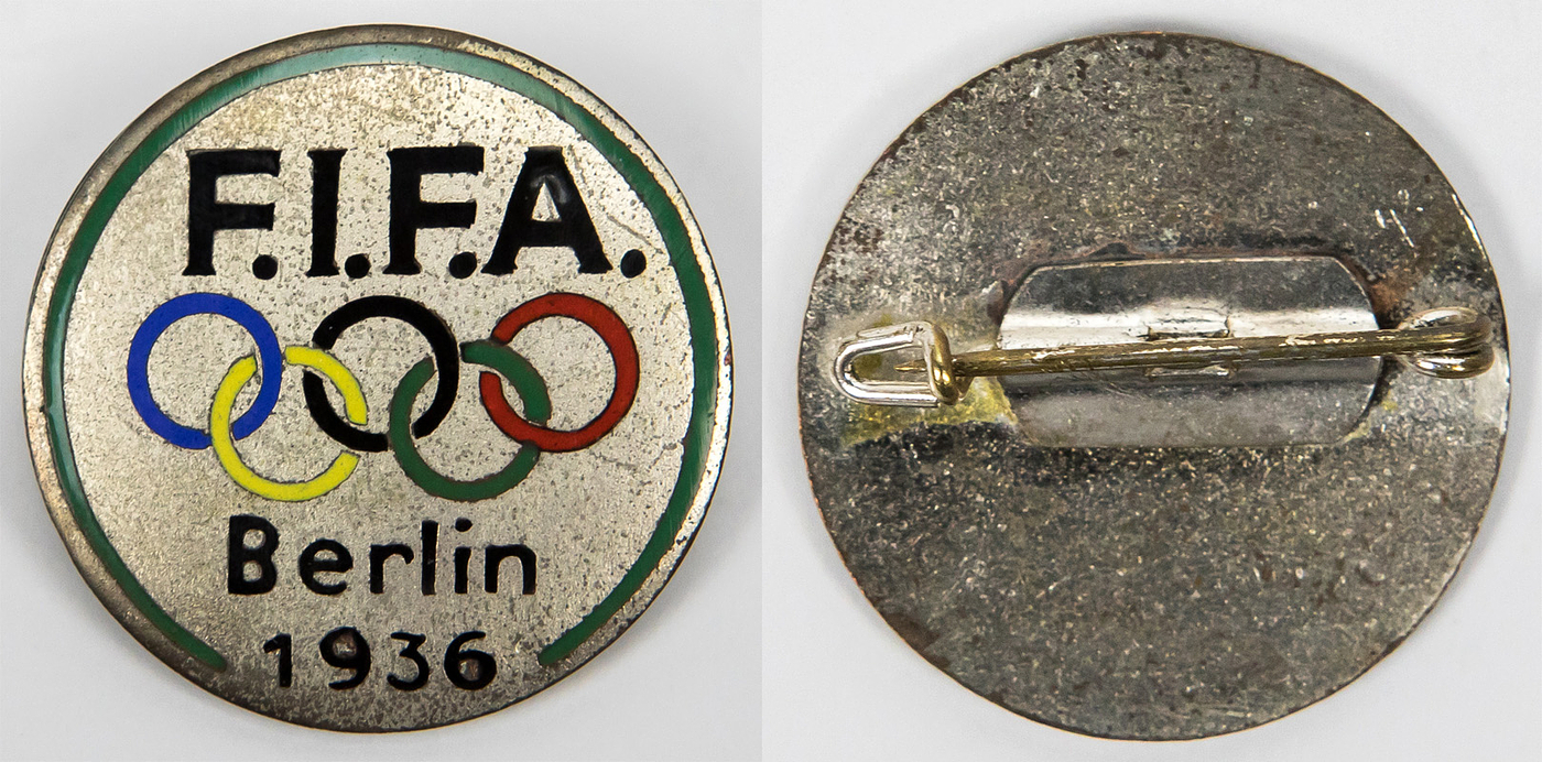 FIFA-Kongress 1936 | "FIFA Berlin 1936". Offizielles Teilnehmerabzeichen der FIFA für den 23. Kongressder am 13. + 14.8.1936 während der Olympische Spiele 1936 in Berlin stattfand. Bronze, versilbert, mehrfarbig emailliert, 3,7 cm.