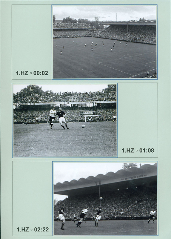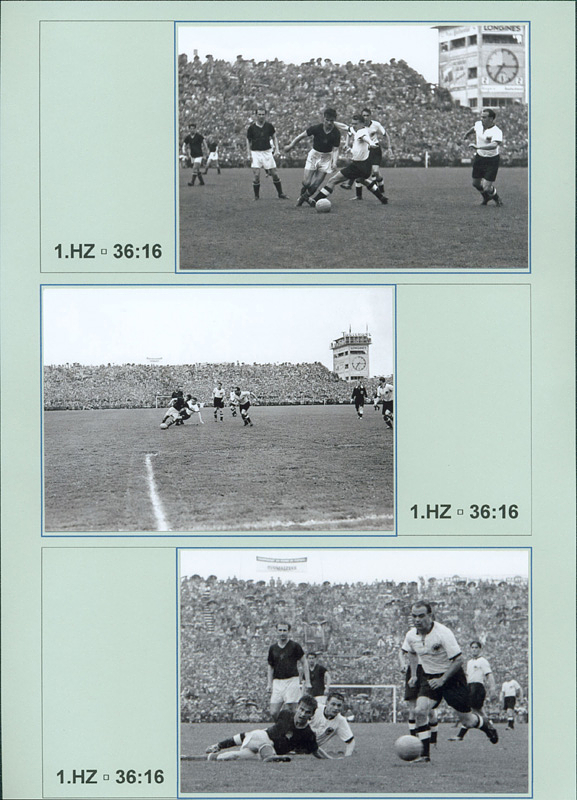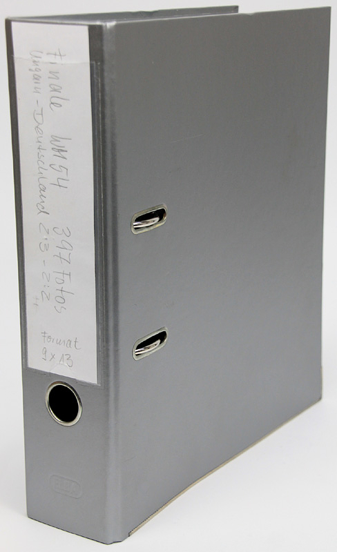 Fotodokumentation Endspiel WM 1954 | Finale Ungarn v Deutschland (Endspiel der Fußball - Weltmeisterschaft 1954) mit 397 S/W-Fotoabzügen (je 13x8,5 cm) in einer Ordner auf DIN A4 Kartons montiert, die die jeweilige Spielminute der Fotoszene anzeigen.