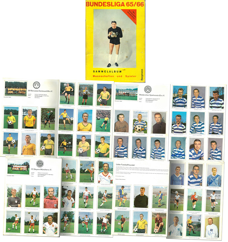 Sammelbilder-Bergmann 65 | Fußball Bildersammelband 1965/66. Bundesliga. Mannschaften und Spieler. Mit dem seltenen Papierumschlag!!!. Mit 274 original signierten Sammelbildern!!!!! Darunter zahlreiche Raritäten. Alle mit Fotoecken einmontiert.