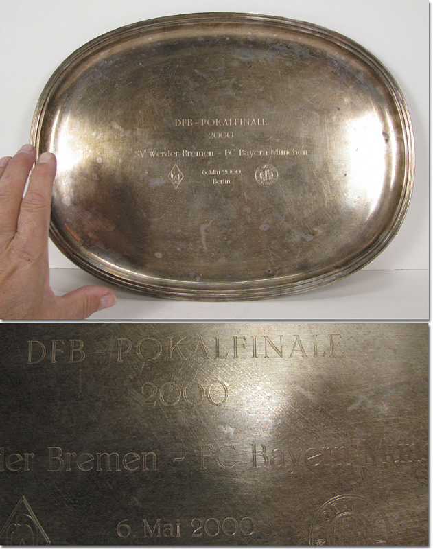 DFB-Pokalfinale 2000 Silbertablett | Großes Silbertablett mit Gravur "DFB-Pokalfinale 2000 Werder Bremen - FC Bayern München 6.Mai 2000 Berlin" (0:3) mit den beiden eingravierten Vereinwappen. Geschenk von Werder Bremen anlässlich des DFB-Pokalfinales an einen sehr hohen DFB-Funktionär. Silber (gepunzt, 925er, WILKENS), Gewicht 880 Gramm,38,5x29,5 cm.