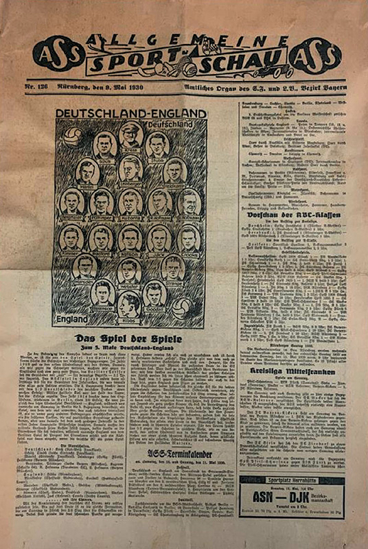 Programm LS1930 | Länderspiel Deutschland - England (3:3) am 10.5.(1930). Berlin Deutsches Stadion. Programm in "ASS Allgemeine Sportschau" Nr. 126 v. 9.Mai 1930 mit den Aufstellungen (line-ups) Beider Mannschaften.