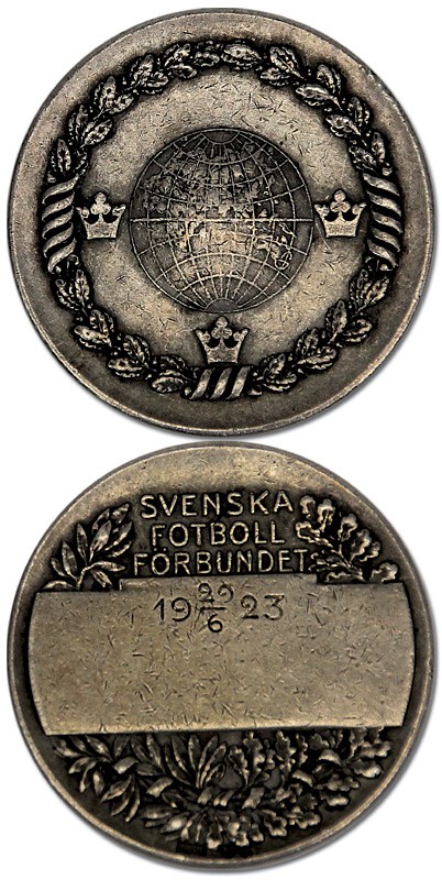 1)Länderspielmedaille 1923 | Offizielle Länderspielmedaille des schwedischen Fußballverbandes für das Länderspiel Schweden v Deutschland (2:1) am 29.6.1923 in Stockholm. Mit Inschrift "Svenska Football Forebundet" und der Gravur des Spieltages "29 - 6 - 1923". Silber (gepunzt), 3,5 cm. Persöniche Medaile von Herny Müller, der in diesem Länderspiel eingesetzt wurde.