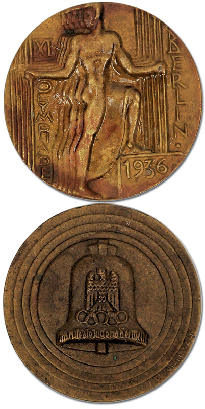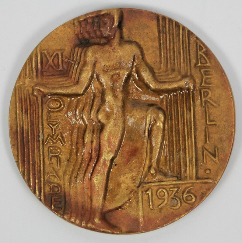 Teilnehmermedaille 1936 | Offizielle Teilnehmermedaille für die Olympischen Sommerspiele von Berlin 1936 (v. Otto Placek). Mit Randpunze "Guss. H.Noack Berlin" Bronzeguß brauner Patina. 7 cm.