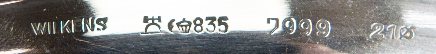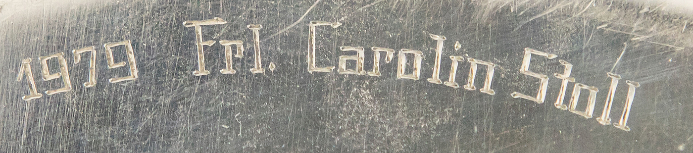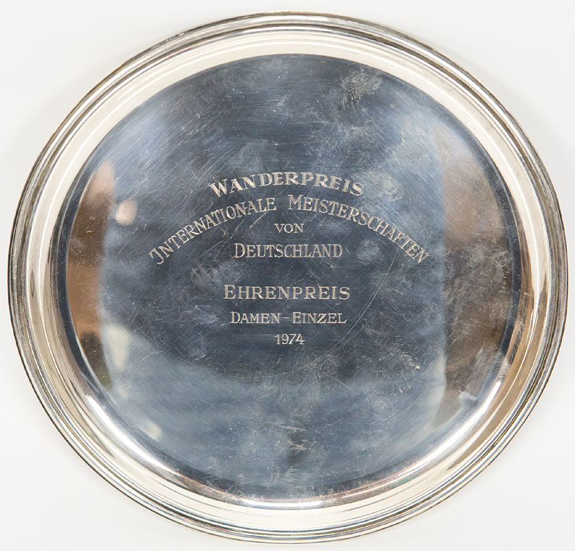 Die eingravierten Namen der Siegerin auf der Rückseite: 1975 Renata Tomanova.1976 Sue Barker. 1977 Laura du Pont. 1978 Mima Jausovec. 1979 Caroline Stoll. 1980 fand das Turnier nicht statt. 1981 Regina Maršíková. 1982 Bettina Bunge. 1983 Chris Evert-Lloyd. 1984 Claudia Kohde-Kilsch. 1985 Chris Evert-Lloyd. Die Internationalen Tennismeisterschaften (German Open) der Damen sind ein offizielles WTA Turnier das bis heute ausgetragen wird. Steffi Graf ist die Rekordgewinnerin dieses Turnieres. Die Frauen Wettbewerbe fanden bis 1978 immer in Hamburg am Rothenbaum statt. Ab 1979 wurde dieses Turnier in Berlin ausgetragen. Der vorliegende "Wanderpreis" wurde 1974 gestiftet und ab 1975 vergeben. Bei dem Wechsel des Turnierortes von Hamburg nach Berlin wurde dieser Wanderpreis bis 1985 weiter geführt. Ein Wanderpreis verbleibt nur ein Jahr im Besitzt der Siegerin und muss dann zurückgegeben werden, um der neuen Siegerin verliehen zu werden. 1985 wurde dieser Wanderpreis nach dem Sieg von Chris Evert Lloyd eingestellt, da er doch eine recht bescheidene Trophae war. Er wurde dann vermutlich an den Stifter nach Hamburg zurückgegeben. Der Wanderpreis wurde am 16.7.2025 in einer Auktion erworben. Er soll aus der Sammlung eines Hamburgers gekommen sein. Zustand: A