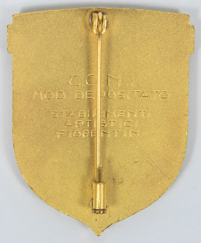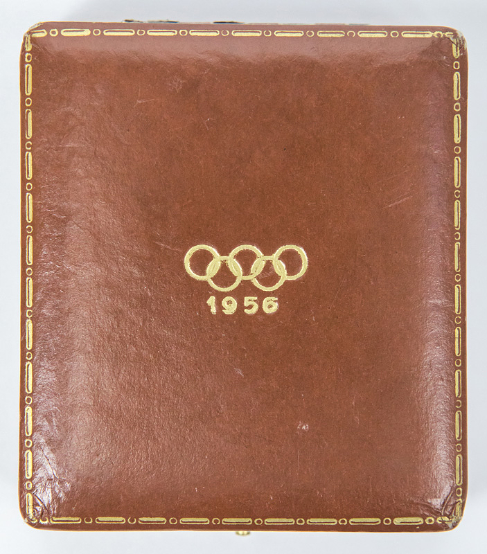 Teilnehmerabzeichen 1956 | Olympische Winterspiele Cortina d´Ampezzo 1956. Offizielles Teilnehmerabzeichen mit der Aufschrift "F.S.I." (Internationaler Verband). Bronze, vergoldet, farbig emailliert, 5x4. In original Lederbox mit den Olympischen Ringen und der Jahreszahl "1956" (9x8x2,2 cm).