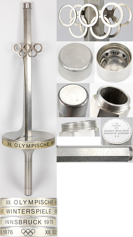 Sehr seltene Fackel von den Olympischen Winterspielen Innsbruck 1976. Von dieser Fackel wurden weniger als 100 Exemplare hergestellt. Diese Fackel wurde bei dem Fackellauf der Olympischen Winterspiele 1976 in Vorarlberg eingesetzt. Die Fackel kommt aus dem Nachlass eines hohen Verwaltungsbeamten aus Vorarlberg der von 1967 bis 1984 für den Sport in diesem österreichischen Bundesland tätig war. Er hat diese Fackel nach dem Fackellauf vom Hersteller als Geschenk bekommen. Die Fackel hat zwei Besonderheiten: 1) Am Handgriff der Fackel wurde von der Hersteller Firma eine Plakette angebracht mit der Aufschrift "Ein Präsent der Vereinigte Metallwerke Ranshofen-Berndorf A.G.". 2) Die Fackelspitze wurde vom Hersteller mit einer aufgeschraubten Kapsel geschlossen, damit sich kein Schmutz innerhalb der Fackel ansammeln kann. In dieser Metallkapsel wurde die Austrittsdüse der Fackel befesetigt. ---Die Fackel hat leichte Korrosionssprenkel. Zustand: A-