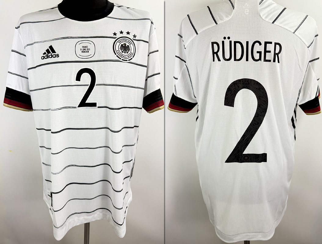 DFB - Trikot 2021 EM | Original match worn DFB Spielertrikot mit der Nummer 2. Getragen von Anthony Rüdiger im Europameisterschaftsspiel Spiel gegen Portugal am 19.06.2021 in München.Trikot stammt aus der Sammlung eines ehemaligen DFB-Mitarbeiters.Set besteht aus Trikot und Hose. StatusAAB.