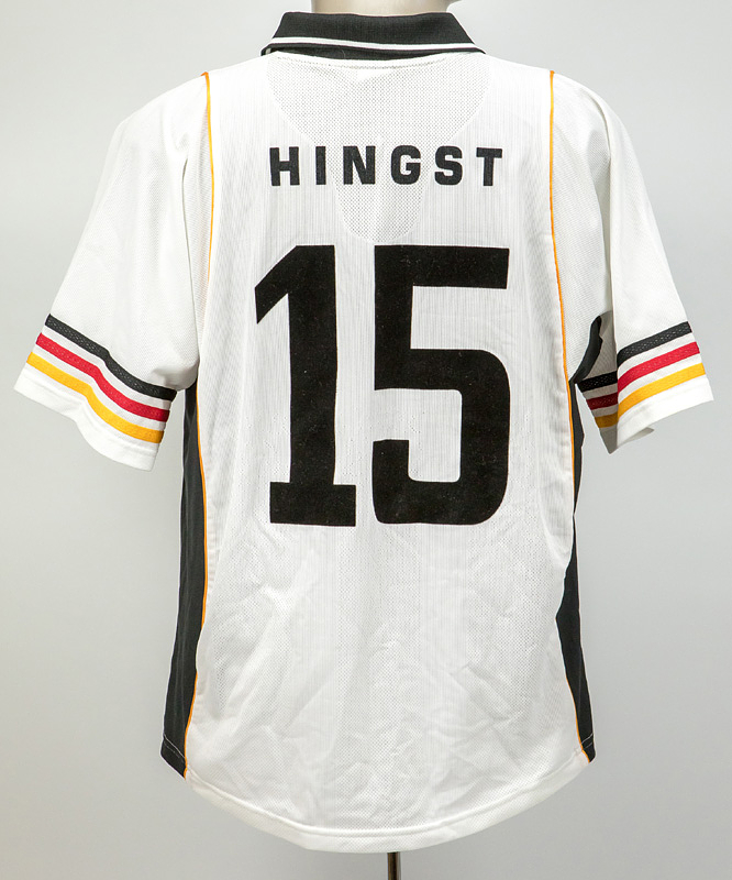 Spielertrikot kurzarm; adidas-Logo gestickt, besticktes DFB-Logo aufgenäht, Rückennummer, Spielername mit Filz geflocktgummiert, Größe L, adidas equipment. Der Einlieferer hat dieses Trikot direkt aus der Sammlung von Ariane Hingst (2fache Weltmeisterin 2003 + 2007; 4fache Europameisterin 1997, 2001, 2005, 2009; Olympische Spiele 2000, 2004, 2008 jeweils Bronze; UEFA-Women´s Cup Siegerin 2005; 174 A-LS DFB; Co-Trainer VfL Wolfsburg 2016-2020). Zustand: A