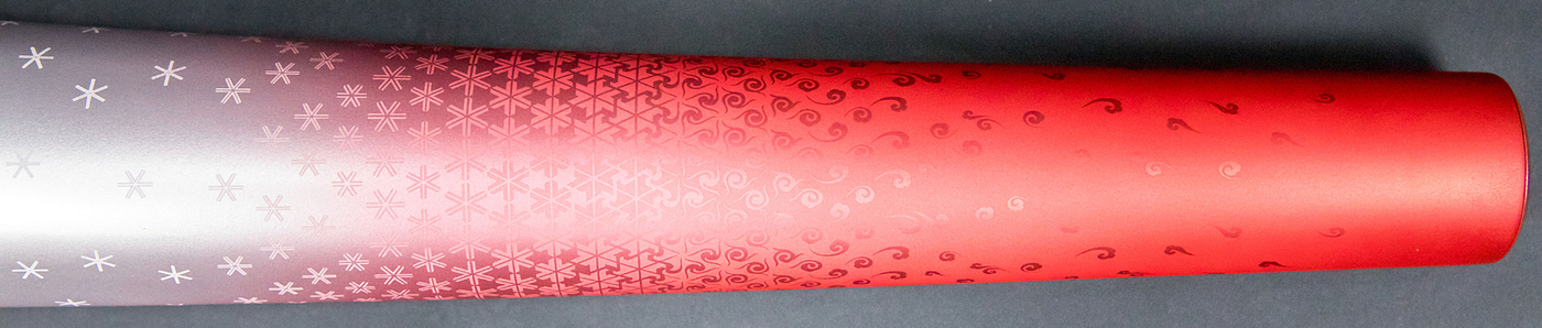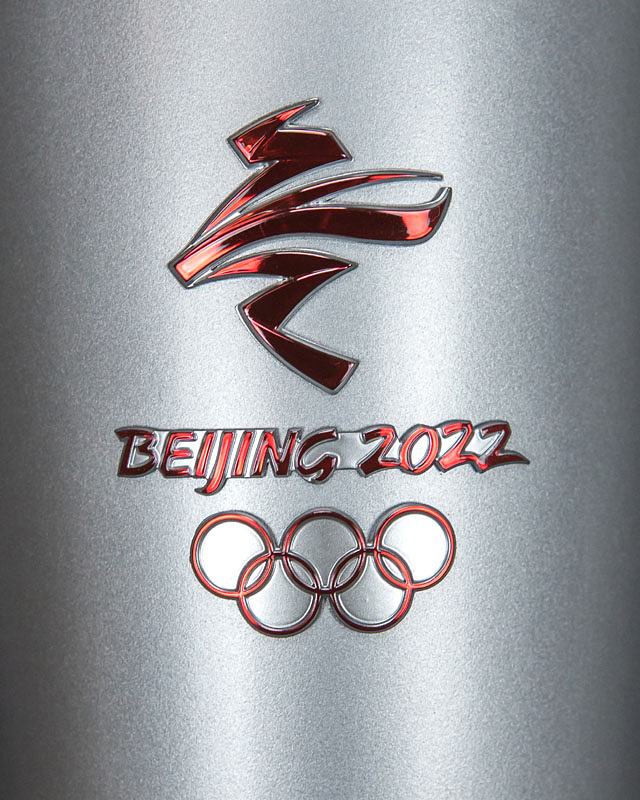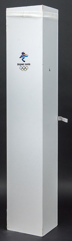 Olympiafackel 2022 | Original Olympiafackel "Flying" von den Olympischen Winterspielen Peking 2022 mit aufgesetztem Logo der Winterspiele und der Aufschrift "Beijing 2022". Desgin von "Lenovo Team". Leichtmetall, 82 cm. In original Präsentationsbox (88x16,2x16,2 cm). Dabei original Ständer für die Fackel.