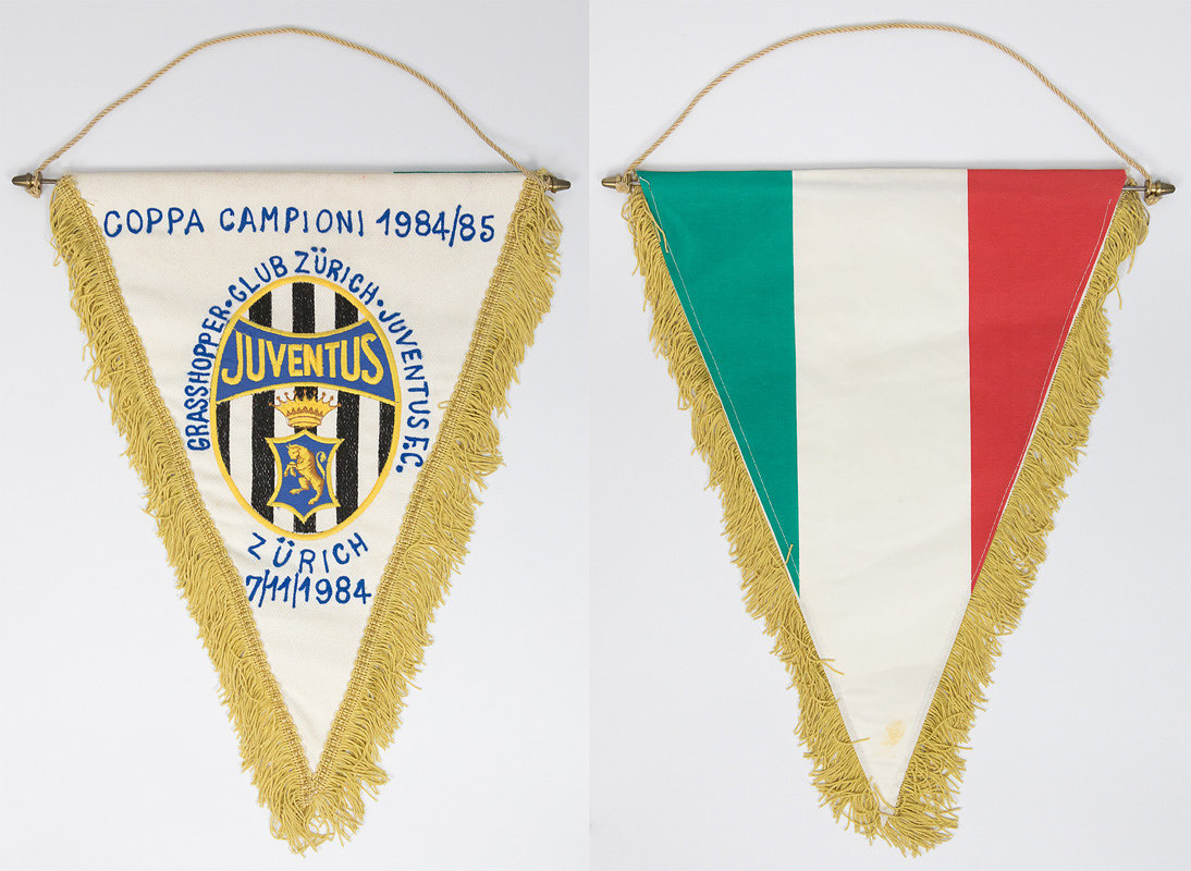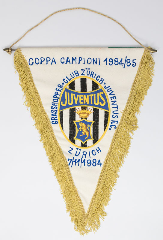 Juventus Turin gewann in dieser Saison 1984/1985 den Europapokal der Landesmeister!! Der Einlieferer hat diesen Wimpel von einem ehemaigen offiziellen von Grasshoppers Zürich erhalten!. Zustand: A