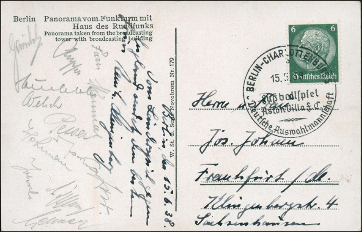 Karte wurde von Münzberger am 15.5.1938 geschrieben. Mit Sonderstempel vom Testspiel Deutsche Auswahl v Aston Villa am 15.5.1938! Zustand: B
