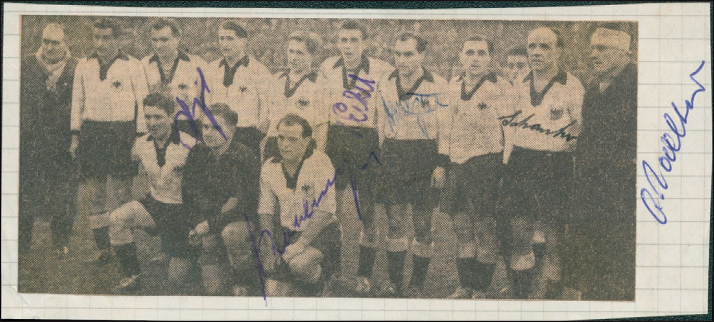 Nationalmannschaft 1953 | S/W-Zeitungsfoto von einem Fußball - Länderspiel der deutschen Nationalmannschaft 1953 mit 6 original Signaturen der Spieler: Posipal, Kohlmeyer, Eckel, Metzner, Schanko, O.Walter. 13,5x6 cm