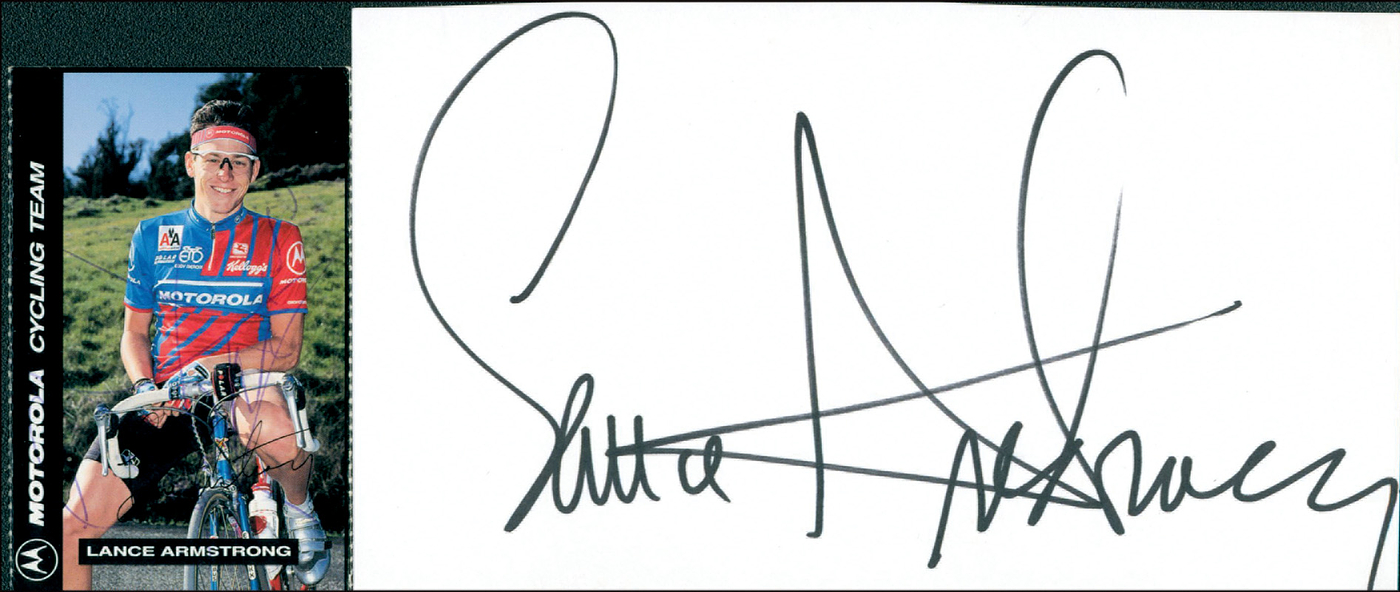 Armstrong, Lance | Sammelkarte und Blancobeleg jeweils mit Originalsignatur vom ehemaligen 5fachen Tour de France Sieger Lance Armstrong. Bronzemedaille im Zeitfahren bei den Olympischen Spielen 2000, die ihm wegen Dopings wieder aberkannt wurde, 17x10 + 8x5,5 cm.